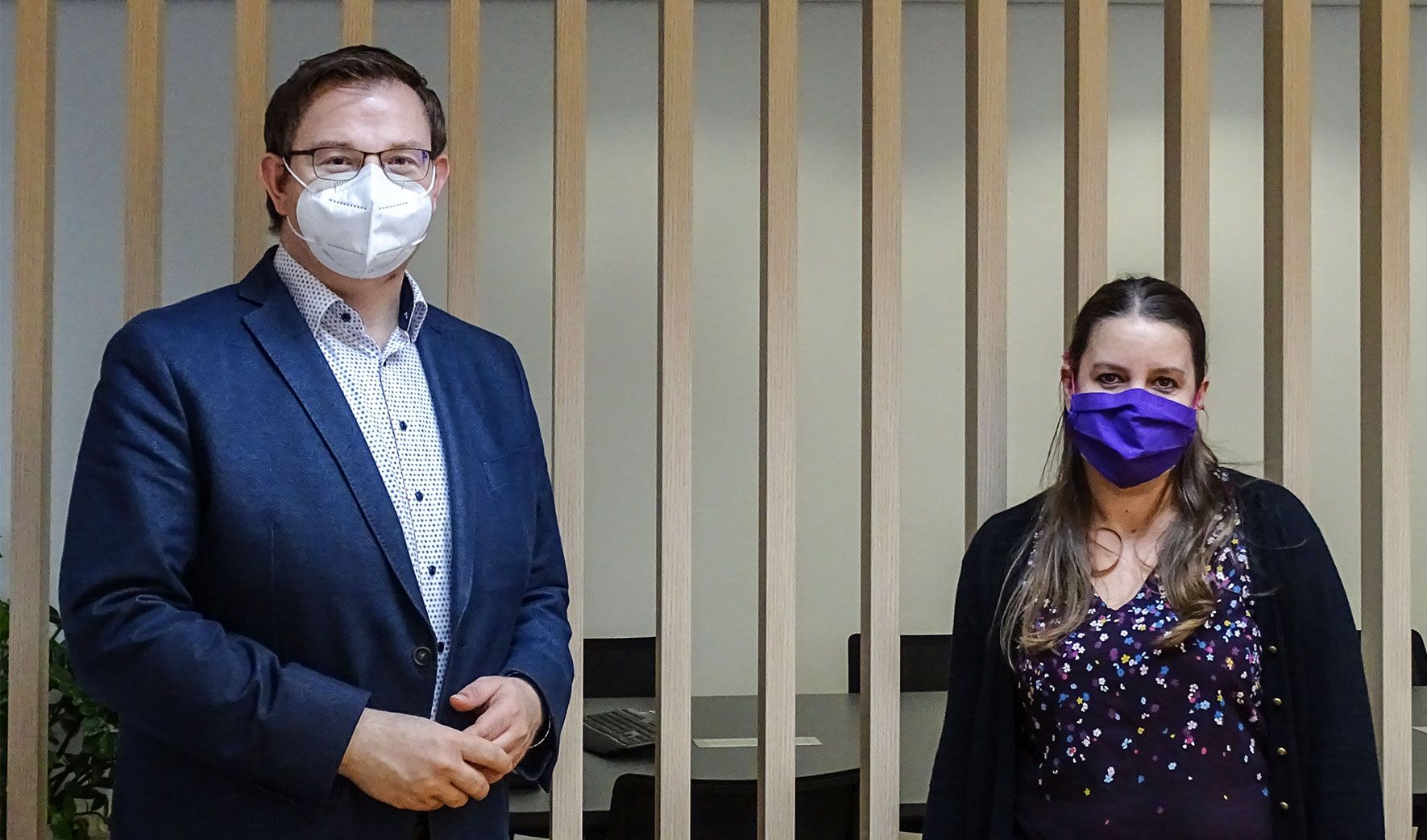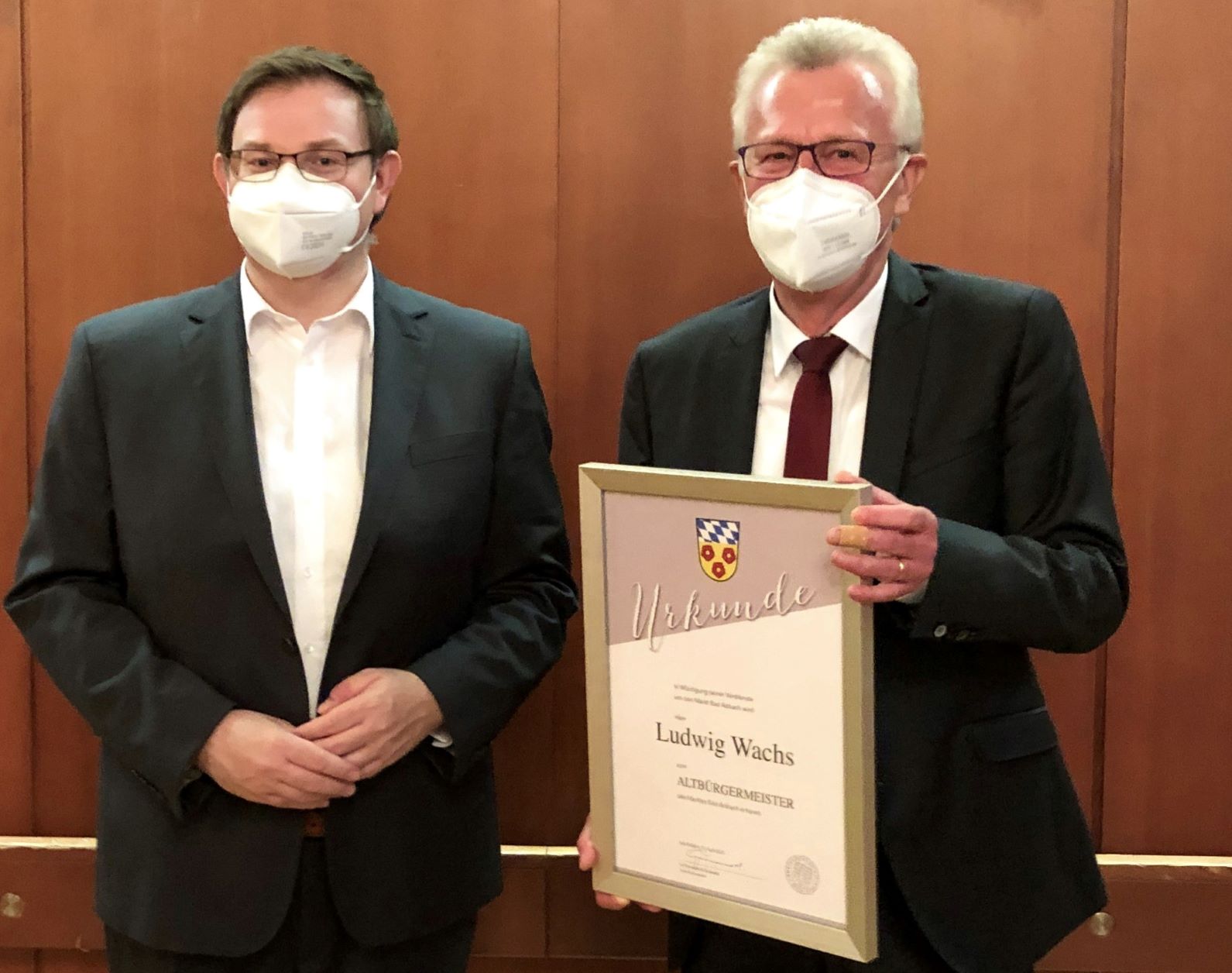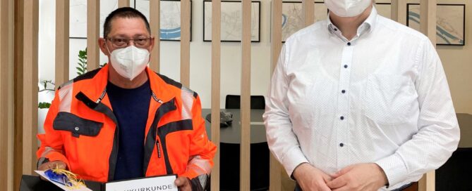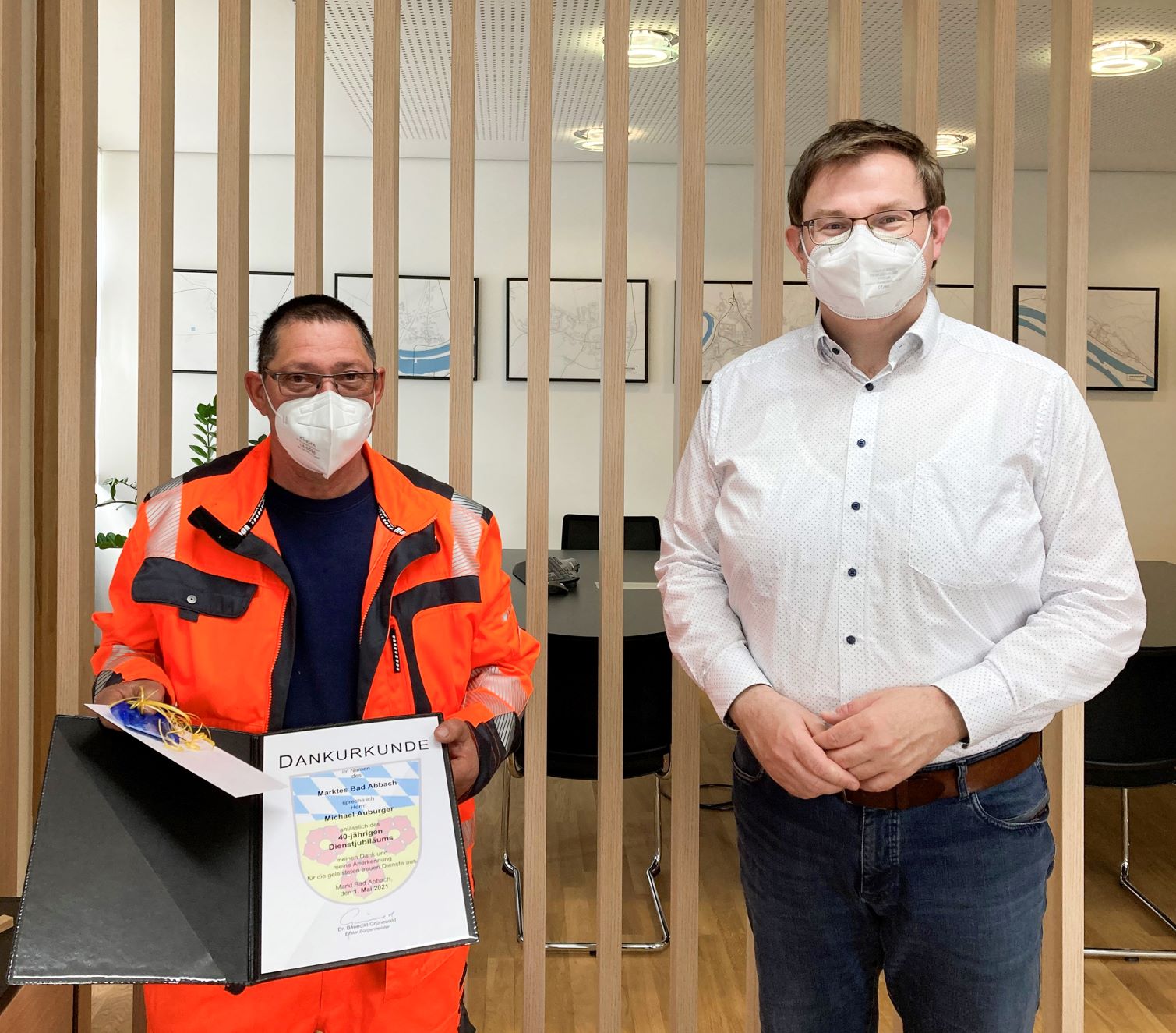 Bad Abbach, 03.05.21 - Erster Bürgermeister Dr. Benedikt Grünewald gratulierte heute Michael Auburger, dem langjährigen Bauhof-Mitarbeiter vom Markt Bad Abbach, zum 40-jährigen Dienstjubiläum. Zur Dankurkunde gab es auch ein symbolisches „Dankeschön“. Foto: Manuela Wahode (Öffentlichkeitsarbeit Markt Bad Abbach)