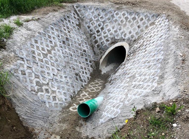 Bild: 2 Rohre leiten das Wasser unter der Verbindungsstraße Kronbergstraße zu Schweinbacher Straße durch auf die rechte Seite, wo eine riesige Fläche als Auffangfläche zur Verfügung steht.